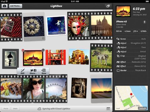Not only that, but it’s even better on the iPad, with a number of awesome features you won’t find on your iPhone, including brush on effects, layers, the ability to adjust image alignments and straighten photos, and the ability to import photos from Flickr and Facebook.